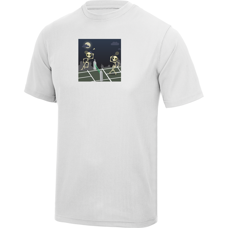Dessin exclusif Goodbad avec 2 squelettes qui jouent au badminton dans un cimetière.